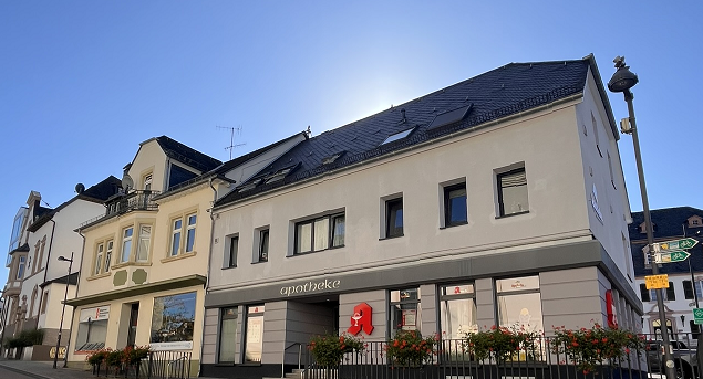 Das Gebäude An der Kirche 5 wurde vollumfänglich saniert und modernisiert, ohne dass jedoch die charakteristische Gestaltung des städtebaulich bedeutsamen Gebäudes verloren gegangen ist. Die Fassade wurde aufwändig nach historischem Vorbild saniert. Unter anderem wurden die im Laufe der Jahre durch Beton ersetzten Sockel mit Sandstein ersetzt und ausgebildet. Auch die Eingangstreppe sowie die Fensterbänke wurden, angelehnt an die ursprüngliche Optik, in Sandstein hergestellt. Die vorhandene Haustür war aufgrund eines Schadens nicht zu erhalten und wurde passend zur Gesamterscheinung des Gebäudes erneuert. Die farbliche Gestaltung der Sandsteinelemente und des Fassadenputzes wurden erneuert und fügen sich hervorragend in die städtebauliche Gestalt der Umgebung ein. Die Maßnahme wurde mit Fördermitteln in Höhe von ca. 30.000 Euro bezuschusst.