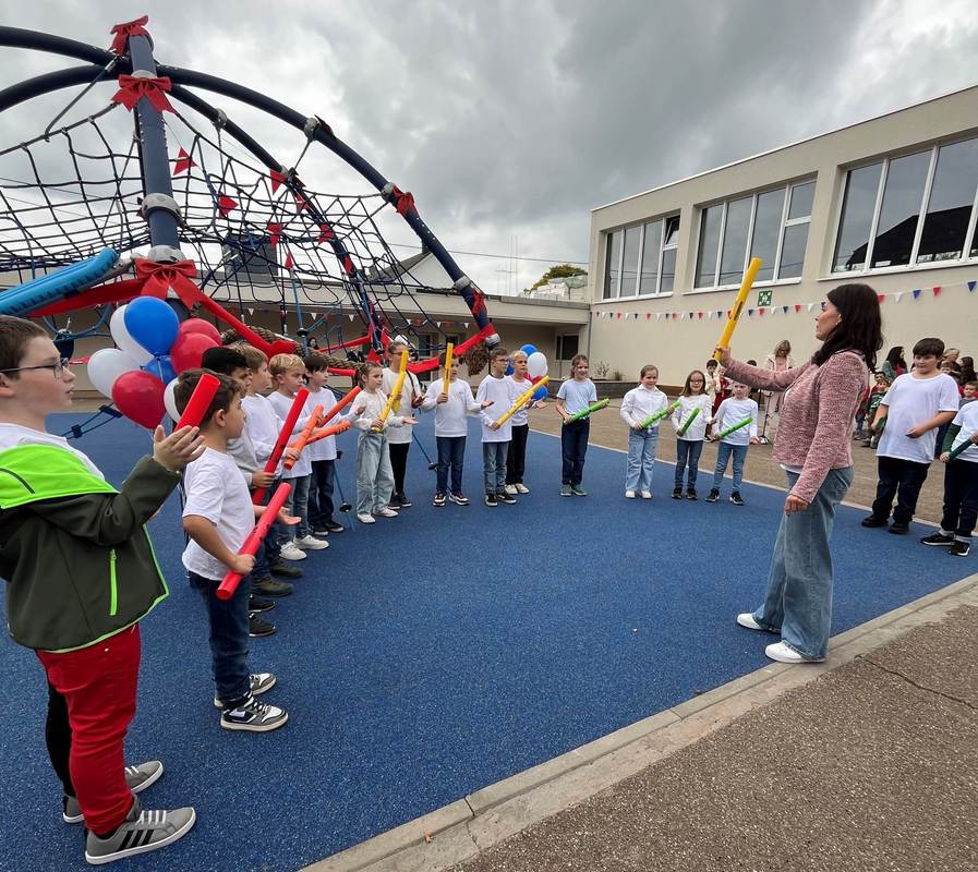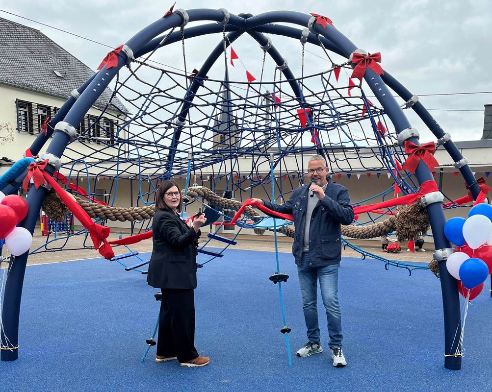 Bürgermeister Jochen Kuttler und Schulleiterin Birgit Schmidt bedankten sich in ihren Grußworten bei allen, die zur Neugestaltung beigetragen haben. Nach einem abwechslungsreichen Musikprogramm, das von verschiedenen Klassen mitgestaltet wurde, hatten die Kinder endlich die Gelegenheit, die Kletterspinne zu erobern.