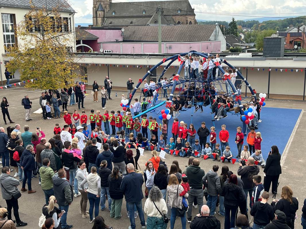 In den letzten drei Jahren hat sich das Bild der Grundschule Nunkirchen komplett gewandelt. Nach den umfassenden Sanierungsarbeiten am Grundschulgebäude im Jahr 2022, bei denen unter anderem neue Fenster, ein Vollwärmeschutz der Fassaden und die Installation von Sonnenschutzvorrichtungen vorgenommen wurden, konnte in 2023 der Neubau der Freiwilligen Ganztagsgrundschule fertiggestellt werden. Aktuell wird das Dach der Pausenhalle ebenfalls saniert. Was den Kindern noch fehlte, waren neue Spielmöglichkeiten auf dem Schulhof. Gestern wurden mit einem Kinderfest die neuen Klettergeräte auf dem Schulhof offiziell ihrer Bestimmung übergeben.